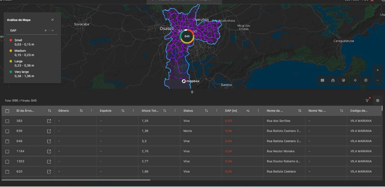 – Localização: A geolocalização precisa das árvores permite a criação de mapas INTERATIVOS e facilita o planejamento de ações futuras.